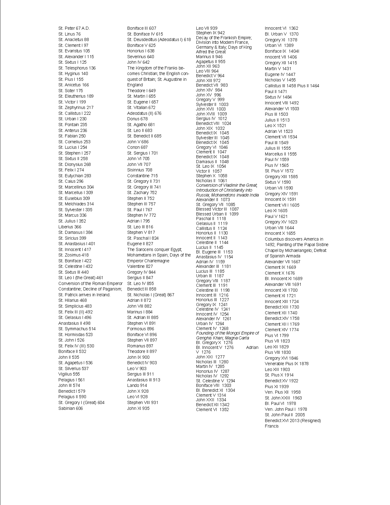 Jesus Christ founded the Catholic Church upon St. Peter the Apostle (Matt 16:18). St. Peter was the first Pope and bishop of Rome where he was martyred in the year A.D. 67. He and his successors follow. (NOTE: Year listed is date of death.)